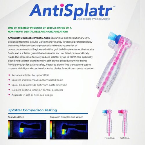 The Anti-Splatter Disposable With Lotus Technology Prophy Angle is a unique and revolutionary DPA designed from the ground up to improve safety for dental professionals by bolstering infection control protocols and reducing the risk of cross-contamination. Engineered with a golf ball dimple exterior that retains fluids and a splatter guard that eliminates accumulated paste and body fluids, this DPA can effectively reduce splatter by up to 100%*. The optimally positioned splatter guard remains stiff during procedures while being flexible