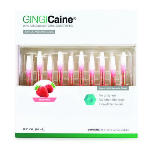 The GINGICaine oral anesthetic gel in syringe form contains a 20% benzocaine formula with a 15-second onset, offering fast and safe pain relief each time — with a strawberry flavor!
